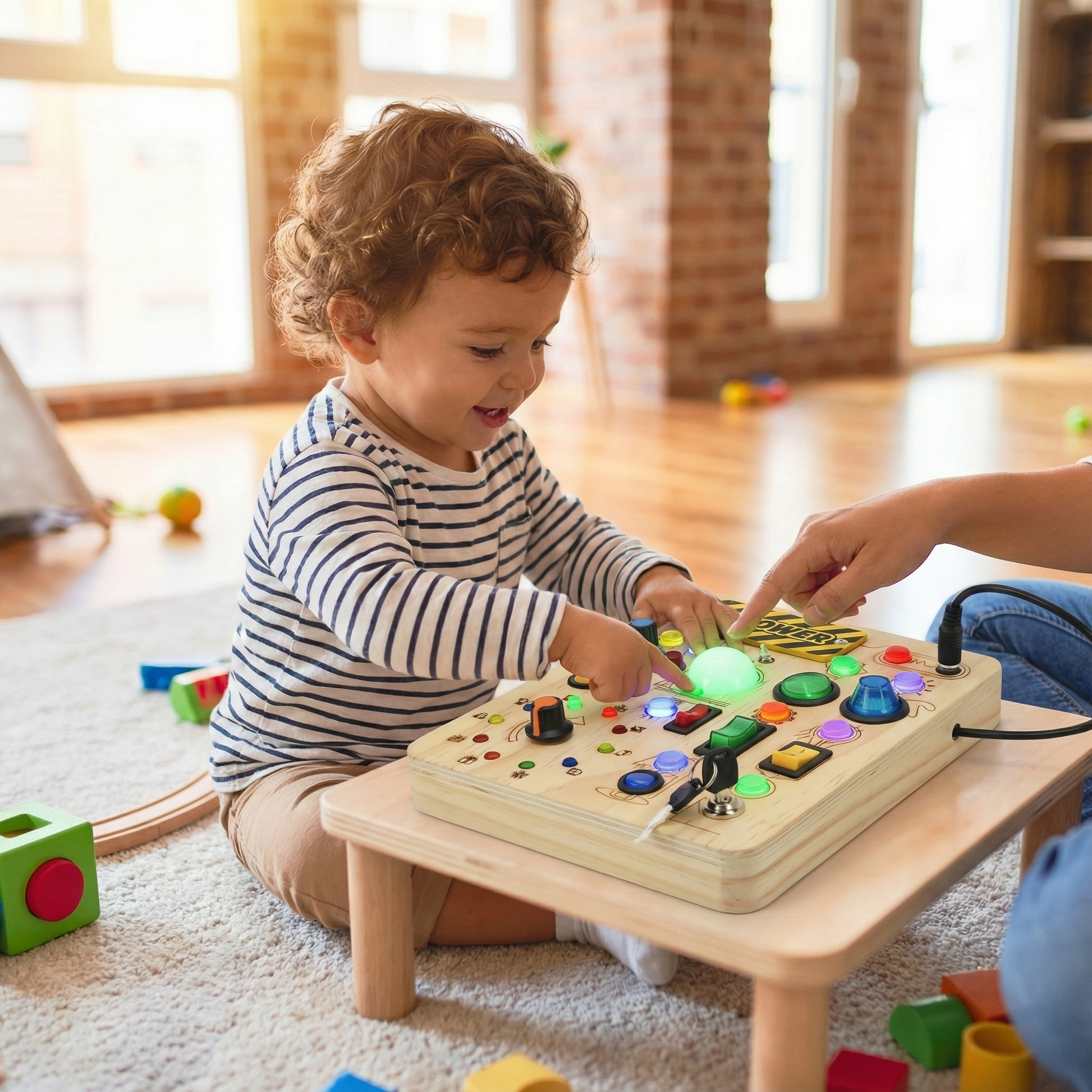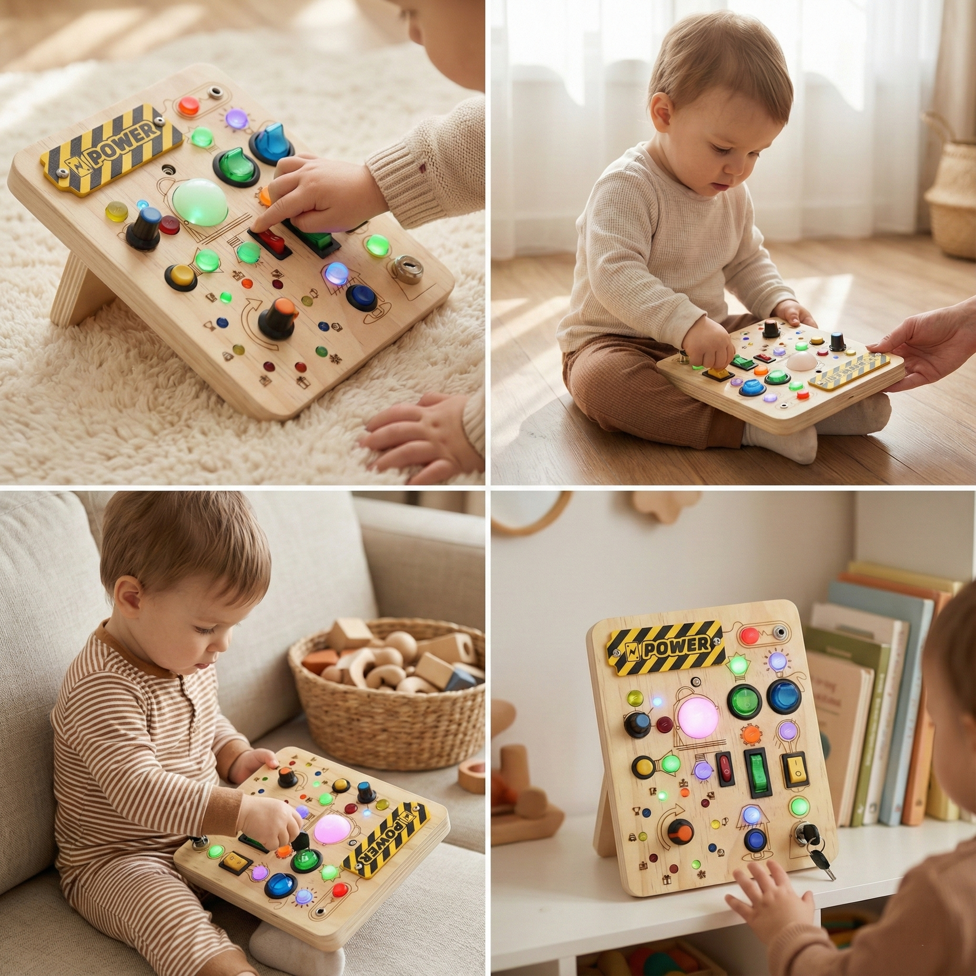 לוח הפעלה מעץ עם 23 נורות ומתגים לפיתוח מוטוריקה